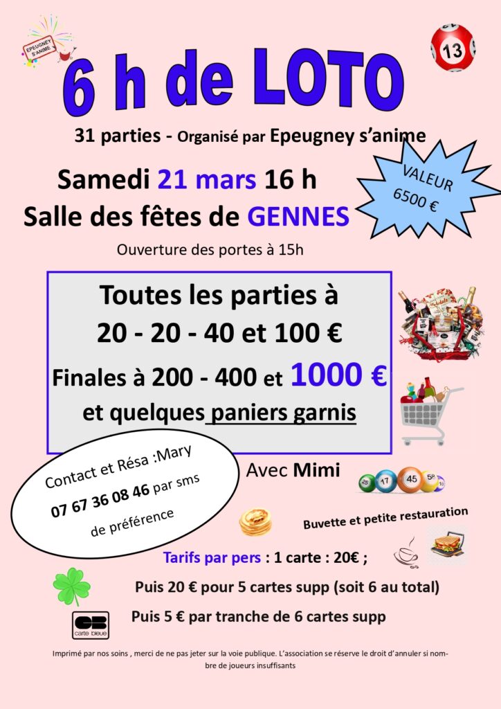 Samedi 21 mars, 16h à Gennes : Super loto. – 6h de loto, soit 31 parties ! Le loto sera animé par Mimi et 6500€ de bons d’achat sont à gagner. Les fonds collectés seront au profit des activités menées au village.